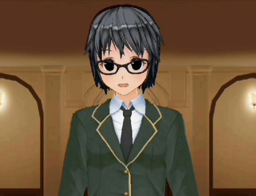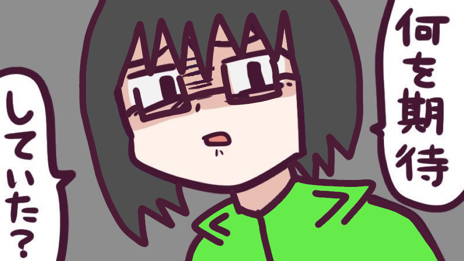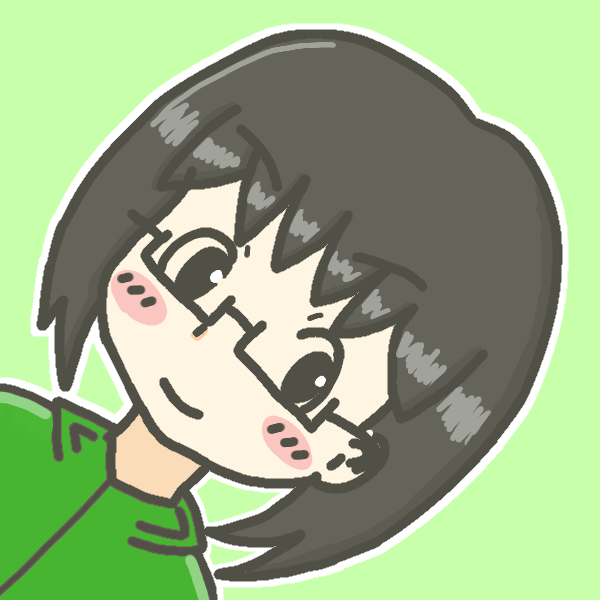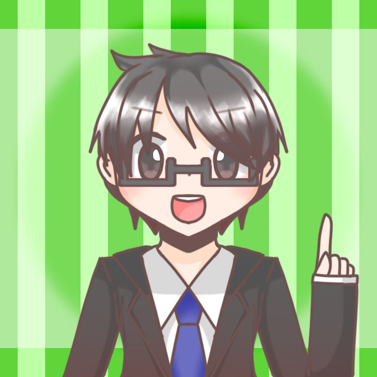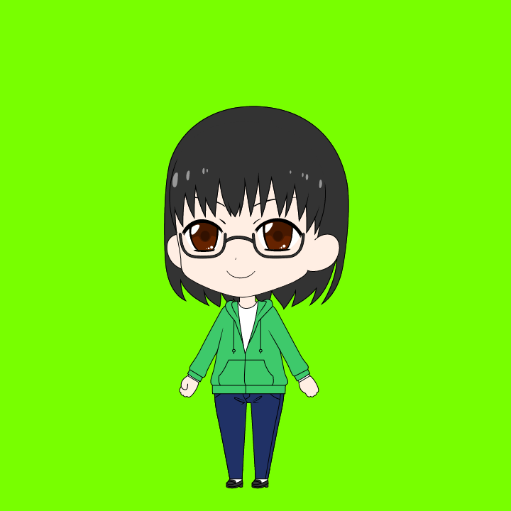 眼鏡をかけており、服装は緑か黄緑色のパーカーに青か紺色のズボン。